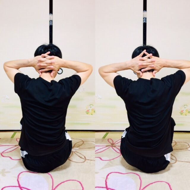 1.後ろ手を組み、肩甲骨を中央に寄せる