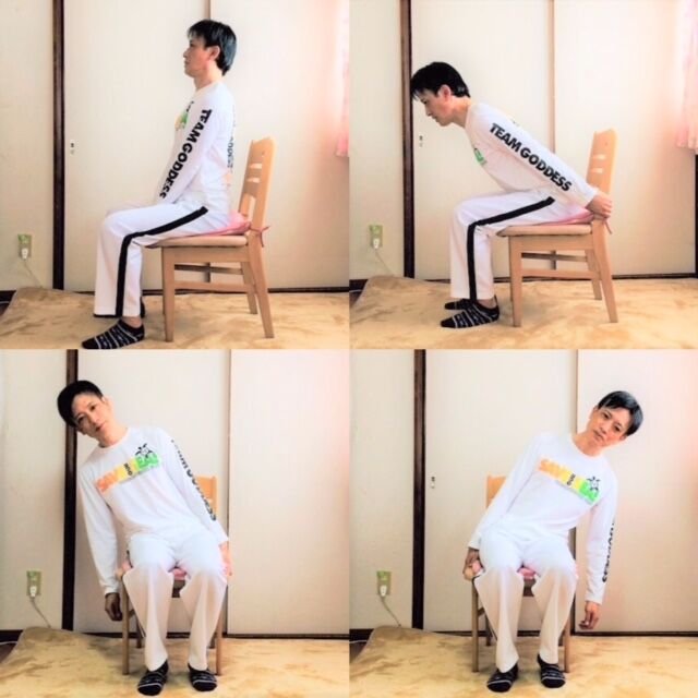 椅子に座るも、なるべく背もたれに頼らず、